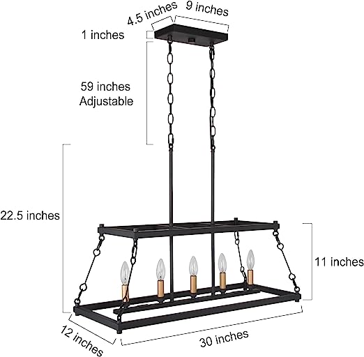 • Ideal Size & Height Adjustable: The light fixture is 30″L x 12″W x 22.5″H. Canopy Size: 9″ x 4.5″ x 1″, available for flat, slightly sloped, or vaulted ceilings. The 59″ height chain is adjustable to be placed in your desired position from Min 25″ to Max 83″ from ceiling to bottom.